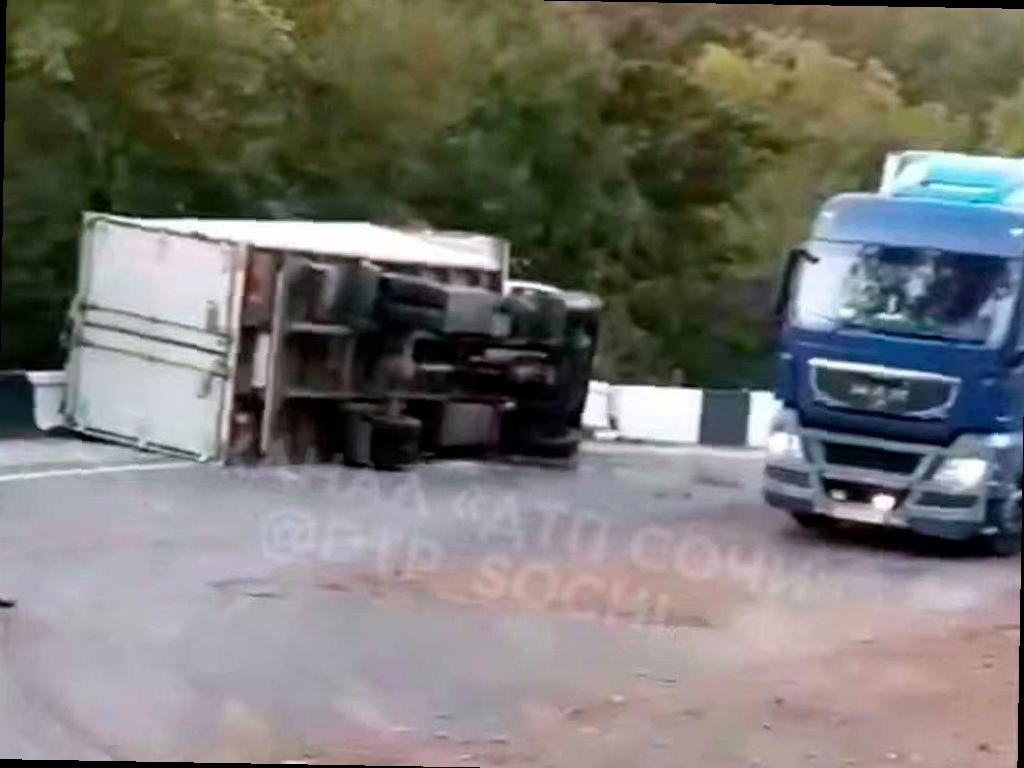 В районе поселка Мамедова Щель на трассе А-147 «Джубга – Сочи» произошла авария. По предварительным данным, водитель не справился с управлением из-за крутого поворота на дороге. Грузовик выехал на встречную полосу и опрокинулся на бок, ударившись о бетонное ограждение.