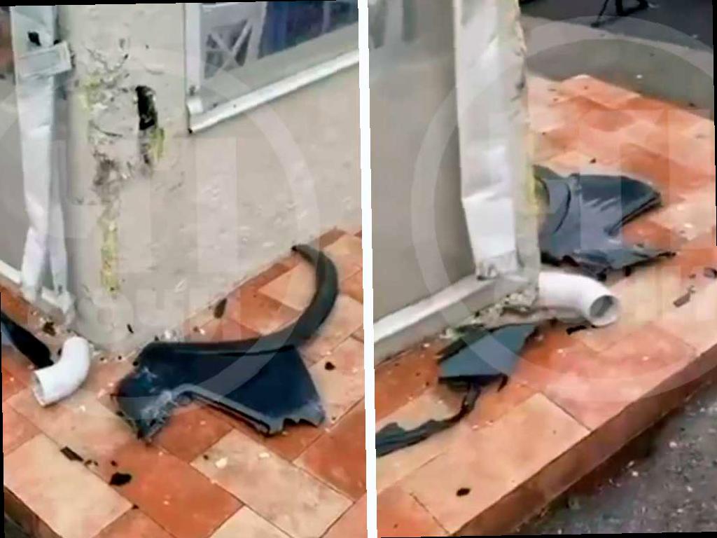 На фотографиях с места происшествия видны разрушенная штукатурка и деформированная водосточная труба. Пол около поврежденного участка усыпан обломками пластика, предположительно, от кузова машины.
