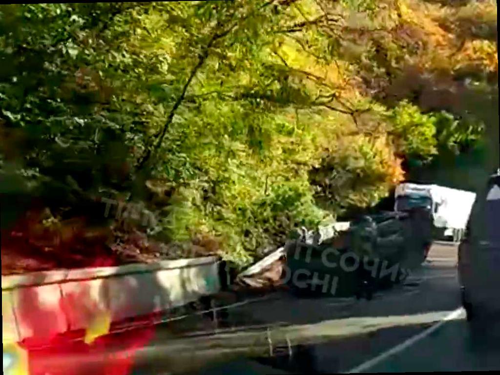 На трассе «Джубга — Сочи» произошла авария сегодня днём. В регистратор попала лежащая на крыше легковая машина между посёлками Шепси и Магри. Видеозапись опубликовал телеграм-канал «ДТП Сочи».